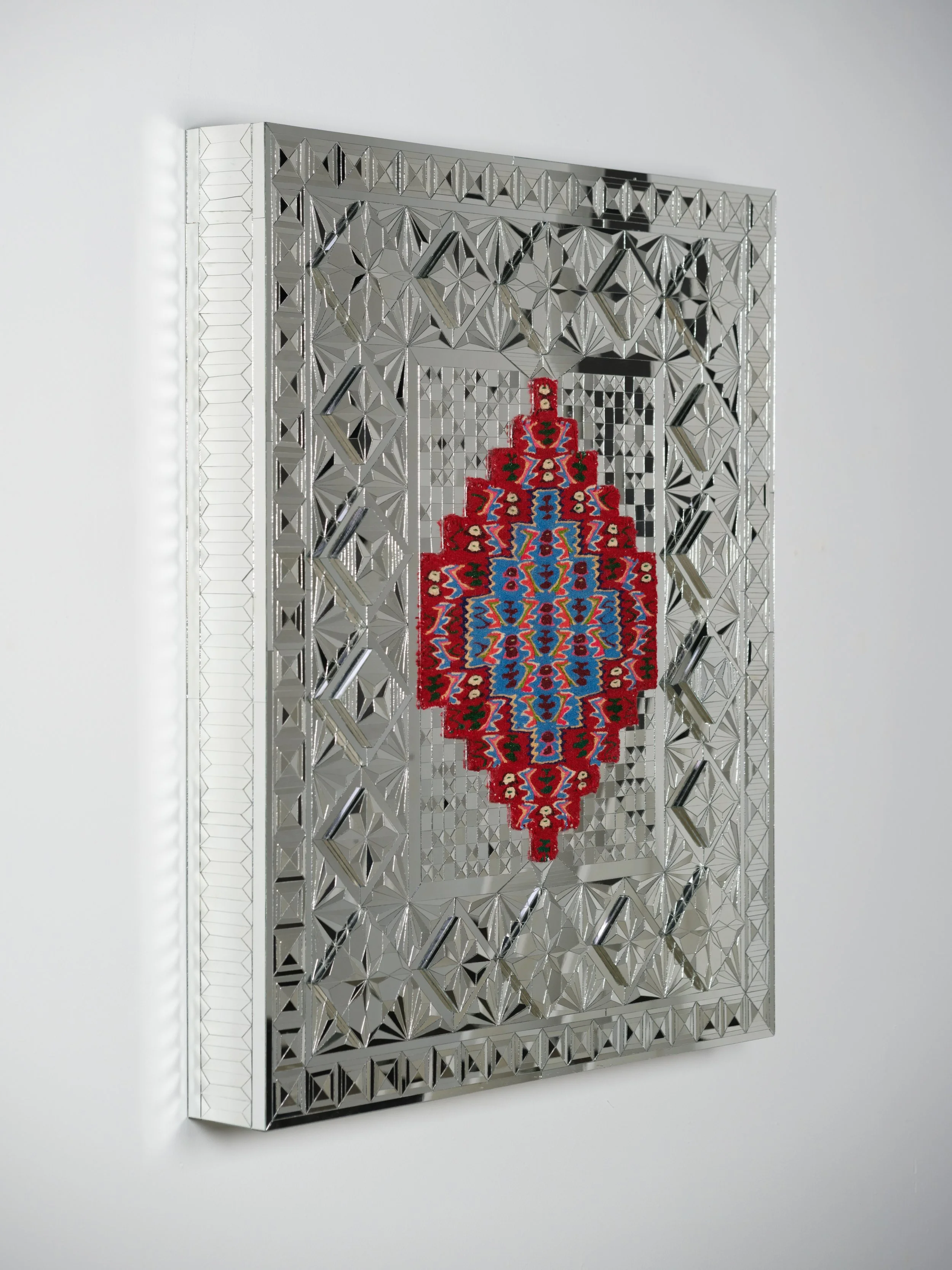 “The Re(in)flections of a Scabbing” centers on a cut-out of a Kurdish kilim called Masî Derhem (mixed fish), a weaving pattern and style specific to my hometown, Sine, the type that I helped my grandmother weave during my childhood and through the war. As she weaved, she recited Kurdish and Judaic myths, using them to make it intelligible to me why family members have been imprisoned, why Kurds are persecuted, and why she puts hope in the work she does. “This row we make so your aunt is released soon,” she would say. She believed in the power of making, so do I. Mirrorwork is an artistic tradition that emerges from the act of repair, amendment, or reconjunction. Initially, broken pieces of mirror were used in the Middle East to adorn the internal spaces of shrines, mosques, palaces, and other significant areas by employing geometric patterns. This work pays attention to memory, the active-creative force of healing, and the internal center of our intergenerational connection that helps navigate turmoil, catastrophes, and hardship.
